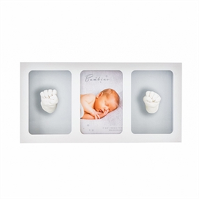 This wall-hanging frame features a sleek matt white finish with a grey washed-wood mount, adorned with silver stars and the heartfelt ‘Love You to the Moon and Back’ sentiment. It has dedicated space for a hospital bracelet, a treasured baby photo, and clay imprints of both hand and foot using the included kit.