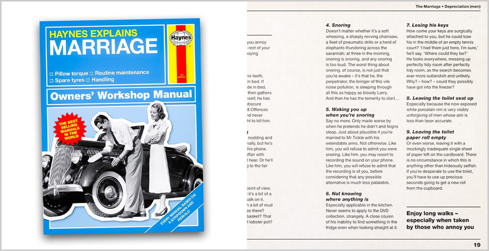 A proper breakdown of the institution of marriage, as if it were a 1998 Volvo. Haynes Explains Marriage is ideal for anyone who's ever wished their spouse came with a user manual and a warranty.