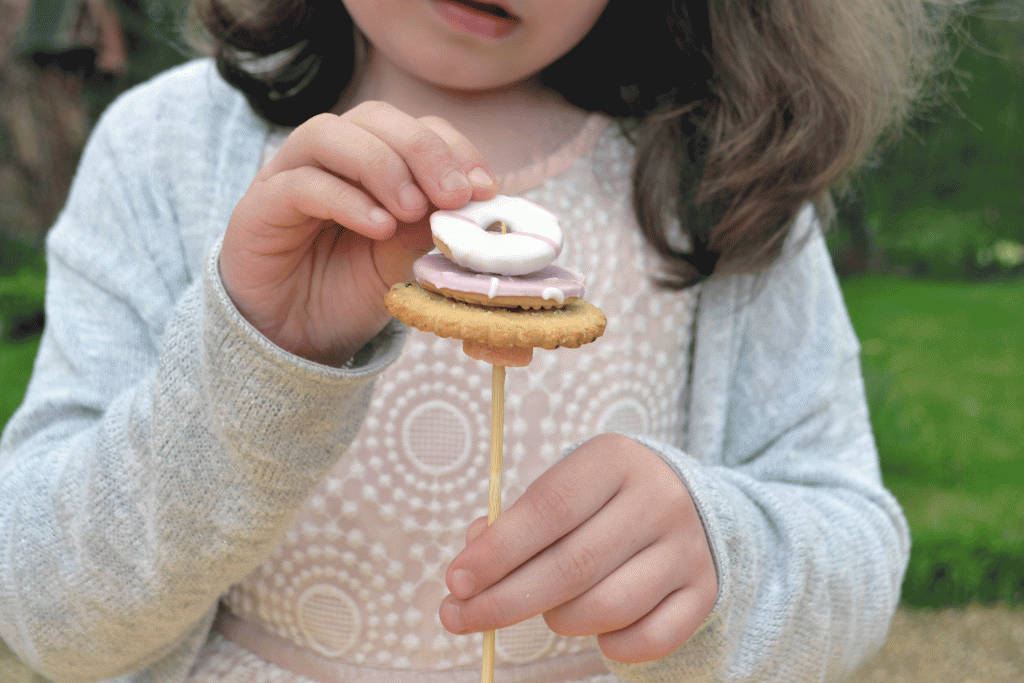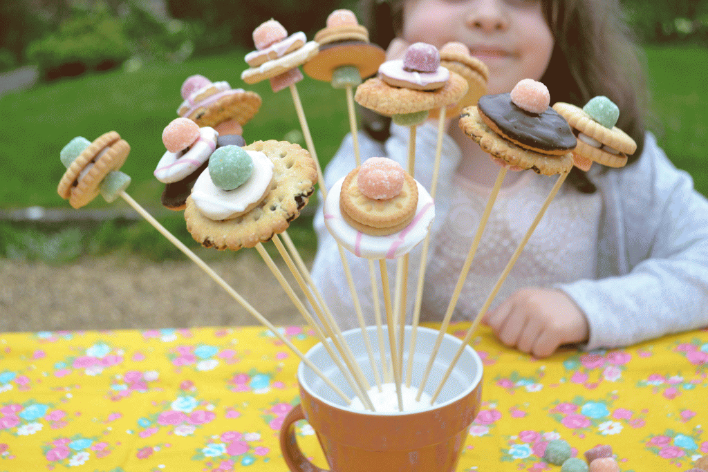 Then layer up your biscuits and top with one more sweet, to create a flower effect. If your biscuits crumble apart, eat the pieces and try again! The trick is to go slow, and rotate the biscuit as you go.