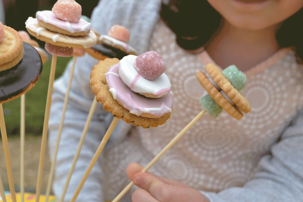 To start your first flower, carefully skewer a sweet. This will sit underneath the head of your flower and prevent your biscuits from sliding down the skewer.